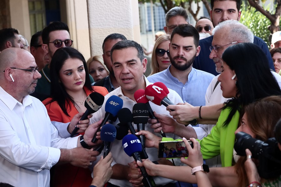 Alexis Tsipras, leader of Greece's main opposition party, SYRIZA-Progressive Alliance, speaks to the media at a polling station in Athens, Greece, June 25, 2023. (Photo by Marios Lolos/Xinhua)