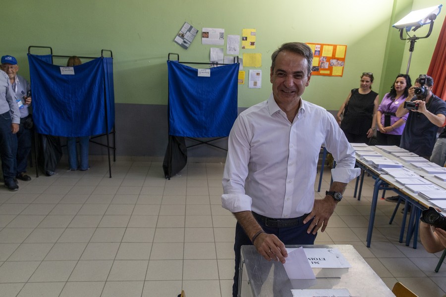 Kyriakos Mitsotakis, leader of Greece's conservative New Democracy (ND) party, casts his ballot at a polling station in Athens, Greece, June 25, 2023. (Photo by Marios Lolos/Xinhua)