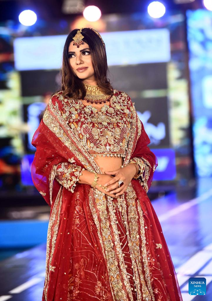 A model presents a creation during a fashion show in southern Pakistani port city of Karachi on June 25, 2023. (Str/Xinhua)