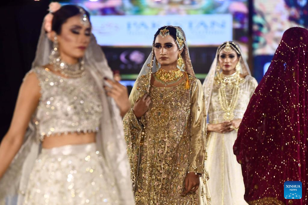 Models present creations during a fashion show in southern Pakistani port city of Karachi on June 25, 2023. (Str/Xinhua)