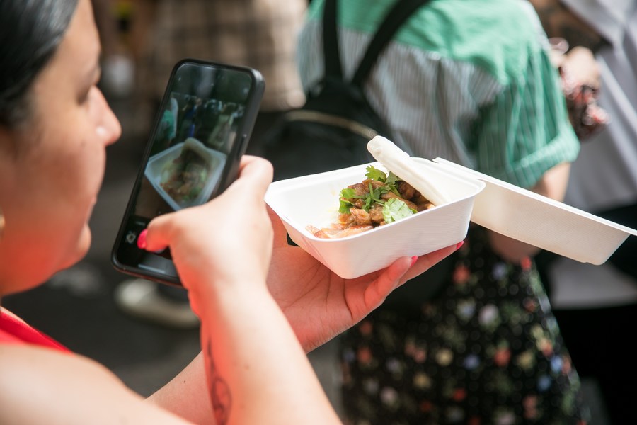 An attendee takes photos of a bun during the Dragon Fest in New York, the United States, on June 24, 2023. (Photo by Michael Nagle/Xinhua)