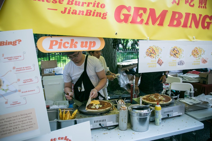 A worker cooks a Jian Bing, or the Chinese crepe, during the Dragon Fest in New York, the United States, on June 24, 2023. (Photo by Michael Nagle/Xinhua)