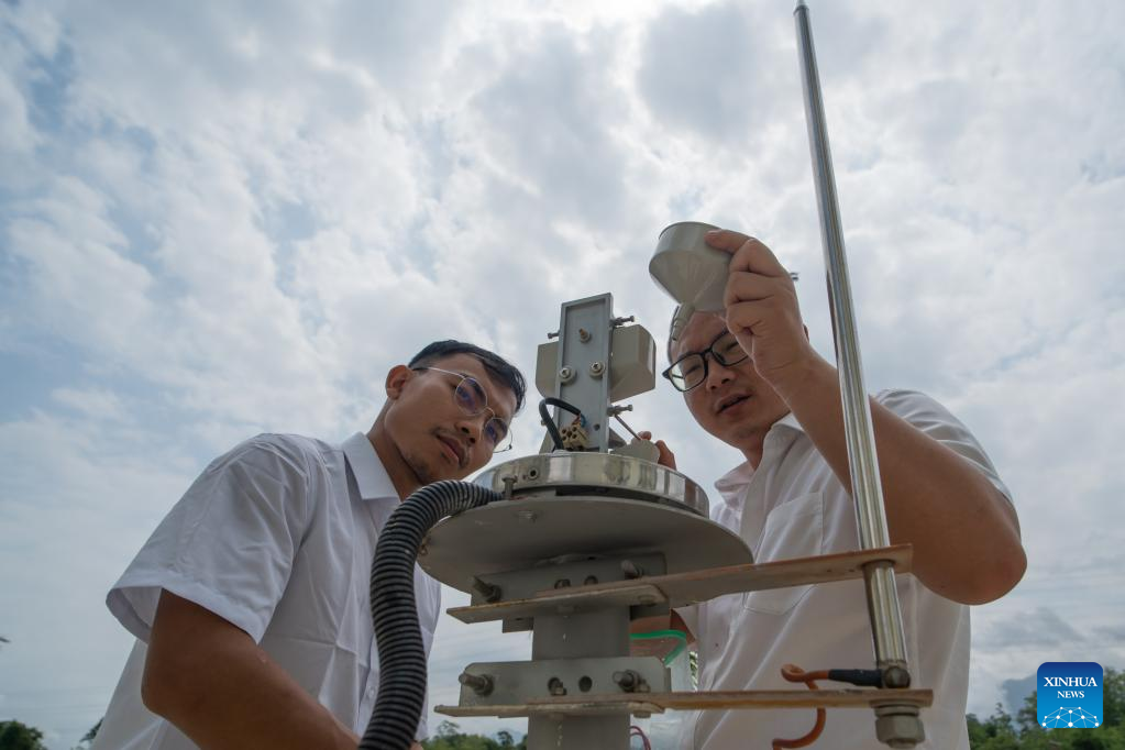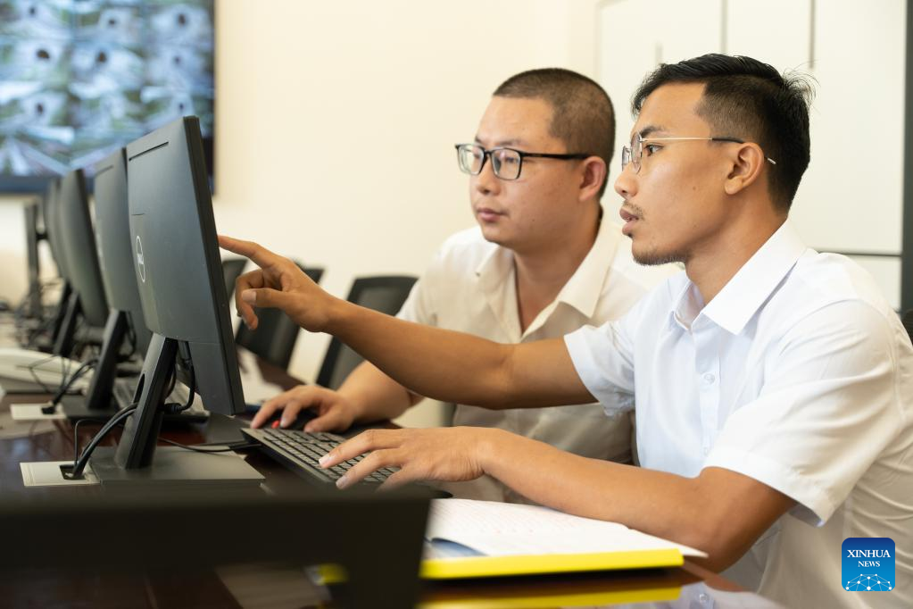 Kaifa works with his Chinese colleague at a maintenance center of the China-Laos Railway in Luang Prabang, Laos, June 15, 2023. (Photo by Kaikeo Saiyasane/Xinhua)