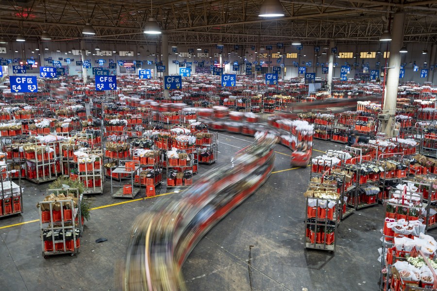 Workers transfer trolleys of flowers at the Kunming International Flora Auction Trading Center in Dounan, southwest China's Yunnan Province, Jan. 31, 2023. (Xinhua/Chen Xinbo)