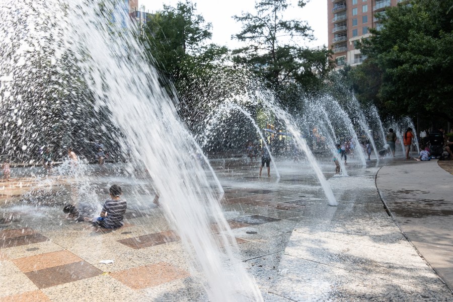 Children play and cool off at a splash park in downtown Houston, Texas, United States, on June 15, 2023. (Photo by Chen Chen/Xinhua)