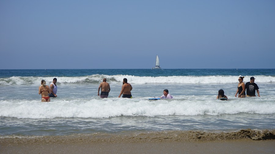 People cool themselves at Santa Monica beach in Los Angeles, California, the United States, on July 11, 2021. (Photo by Zeng Hui/Xinhua)