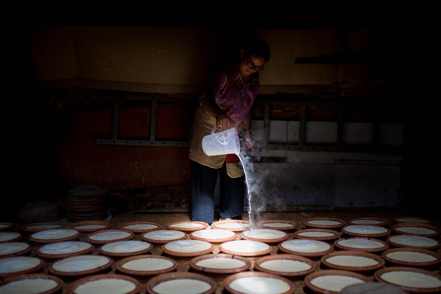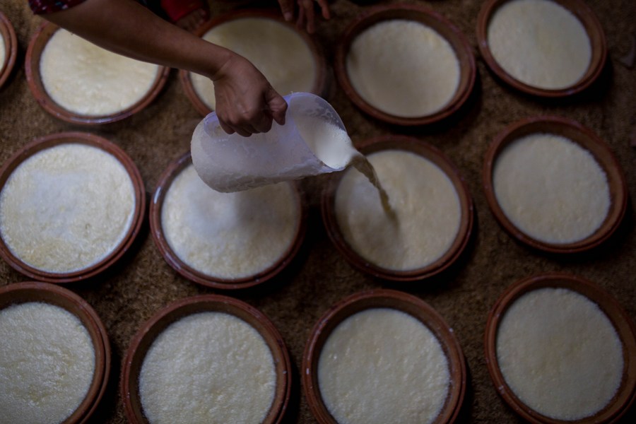 Yogurt is made for sale in the market as Asar Pandra, also known as National Paddy Day, approaches in Bhaktapur, Nepal, June 27, 2023. (Photo by Sulav Shrestha/Xinhua)
