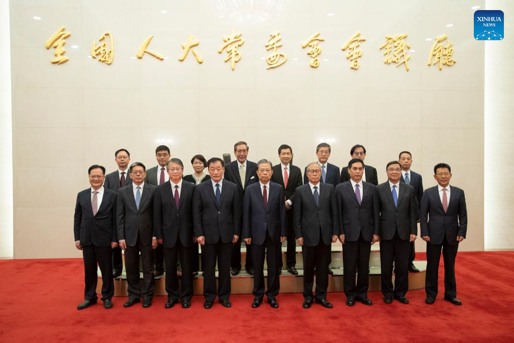 Zhao Leji, chairman of the National People's Congress (NPC) Standing Committee, poses for a group photo with members of the sixth-term Committee for the Basic Law of the Hong Kong Special Administrative Region of the NPC Standing Committee and new members of the fifth-term Committee for the Basic Law of the Macao Special Administrative Region of the NPC Standing Committee at the Great Hall of the People in Beijing, capital of China, June 28, 2023. Zhao granted letters of appointment to these members on Wednesday in Beijing. (Xinhua/Li Tao)