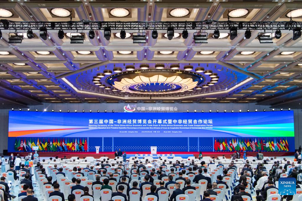 This photo shows the opening ceremony of the third China-Africa Economic and Trade Expo at the Changsha International Conference Center in Changsha, central China's Hunan Province, June 29, 2023. The third China-Africa Economic and Trade Expo kicked off Thursday in Changsha. The expo welcomes more "Made in Africa" products into China and aims to boost business links between the two sides.