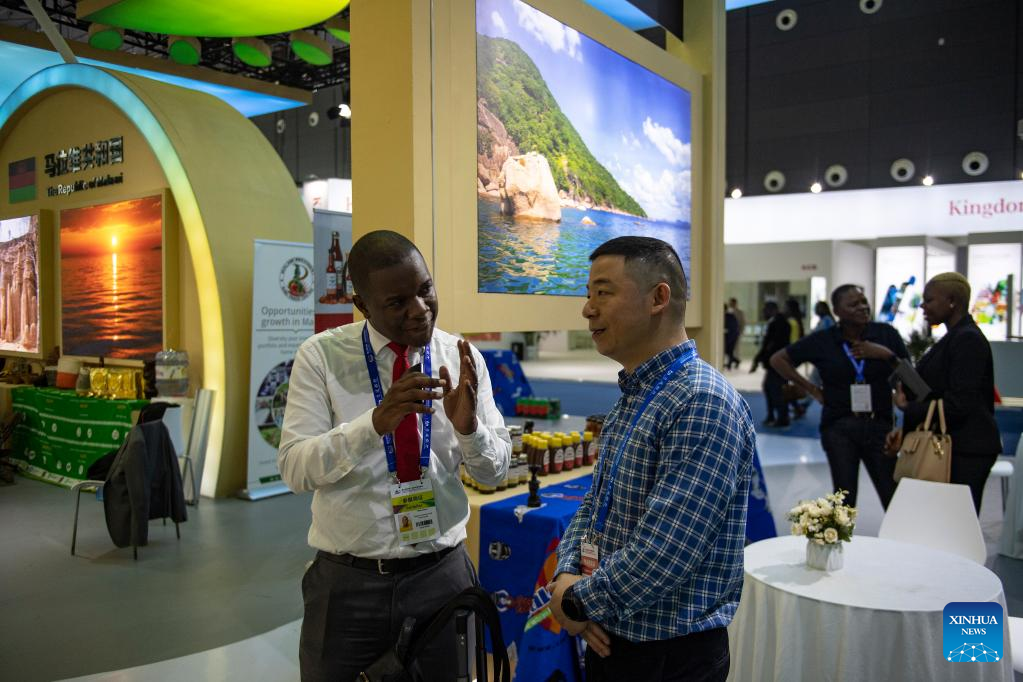 A Malawian exhibitor talks with a visitor during the third China-Africa Economic and Trade Expo at the Changsha International Convention and Exhibition Center in Changsha, central China's Hunan Province, June 29, 2023. The third China-Africa Economic and Trade Expo kicked off Thursday in Changsha. The expo welcomes more "Made in Africa" products into China and aims to boost business links between the two sides.