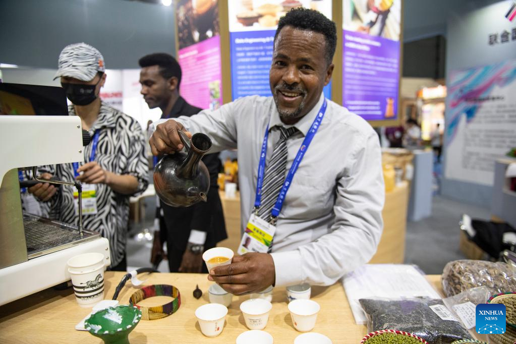 An exhibitor presents Ethiopian coffee during the third China-Africa Economic and Trade Expo at the Changsha International Convention and Exhibition Center in Changsha, central China's Hunan Province, June 29, 2023. The third China-Africa Economic and Trade Expo kicked off Thursday in Changsha. The expo welcomes more "Made in Africa" products into China and aims to boost business links between the two sides.