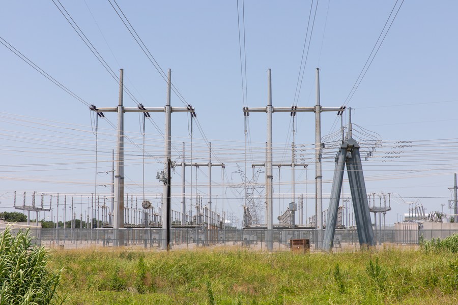 Photo taken on June 27, 2023 shows electric power transmission lines in Plano, Texas, the United States. (Photo by Dan Tian/Xinhua)