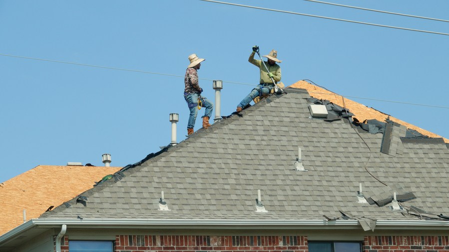 Workers repair a roof during a heat wave in Plano, Texas, the United States, on June 27, 2023. (Photo by Dan Tian/Xinhua)