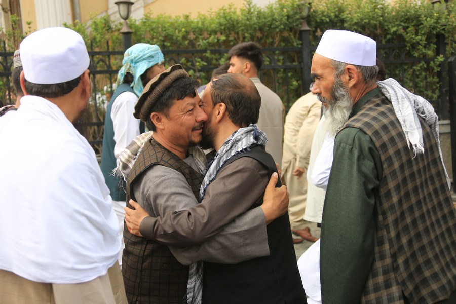 People embrace each other during Eid al-Adha in Kabul, capital of Afghanistan, on June 28, 2023. (Photo by Saifurahman Safi/Xinhua)