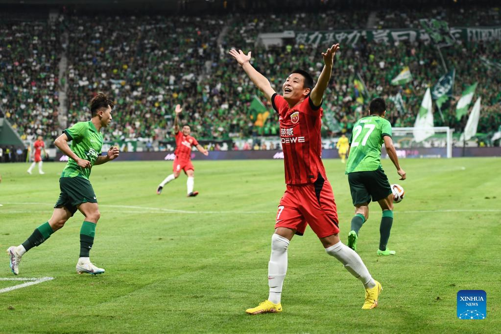 Wu Lei (front) of Shanghai Port reacts during the 2023 season Chinese Football Association Super League (CSL) 13th round match between Beijing Guoan and Shanghai Port in Beijing, capital of China, June 29, 2023. (Xinhua/Chen Zhonghao)