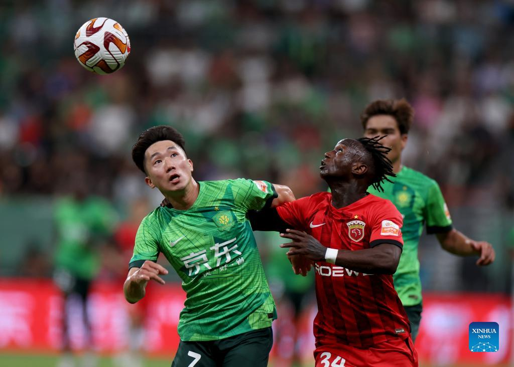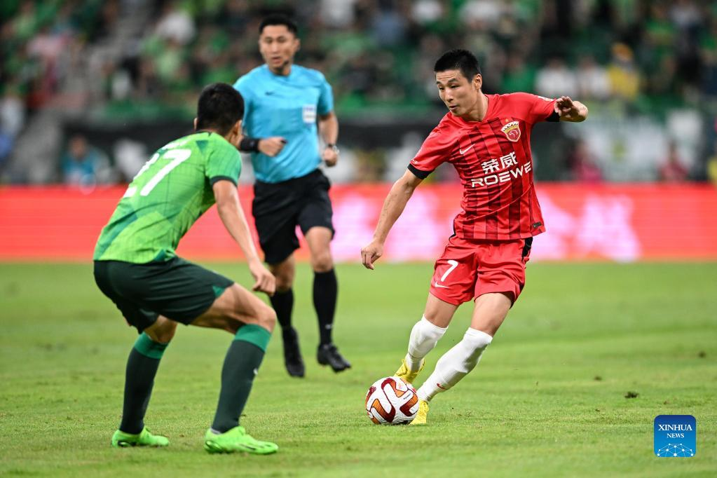 Wu Lei (R) of Shanghai Port competes during the 2023 season Chinese Football Association Super League (CSL) 13th round match between Beijing Guoan and Shanghai Port in Beijing, capital of China, June 29, 2023. (Xinhua/Chen Zhonghao)