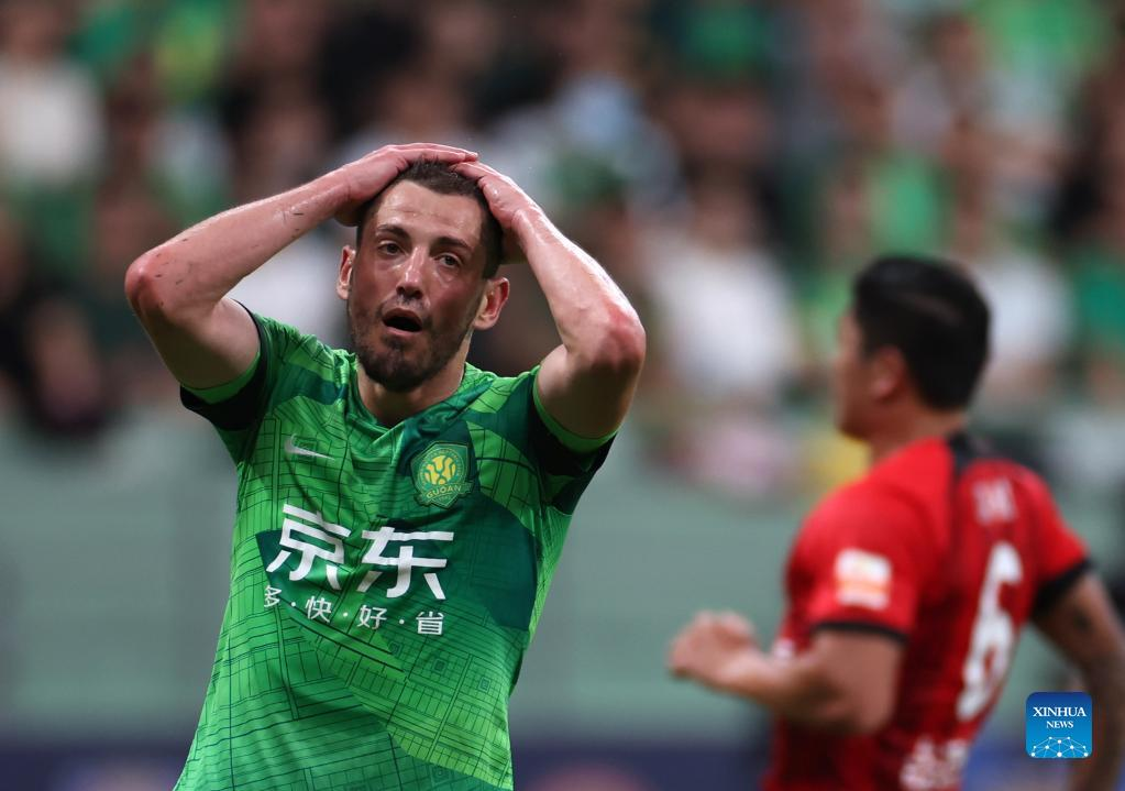 Arijan Ademi of Beijing Guoan reacts after missing a goal during the 2023 season Chinese Football Association Super League (CSL) 13th round match between Beijing Guoan and Shanghai Port in Beijing, capital of China, June 29, 2023. (Xinhua/Zhang Chen)