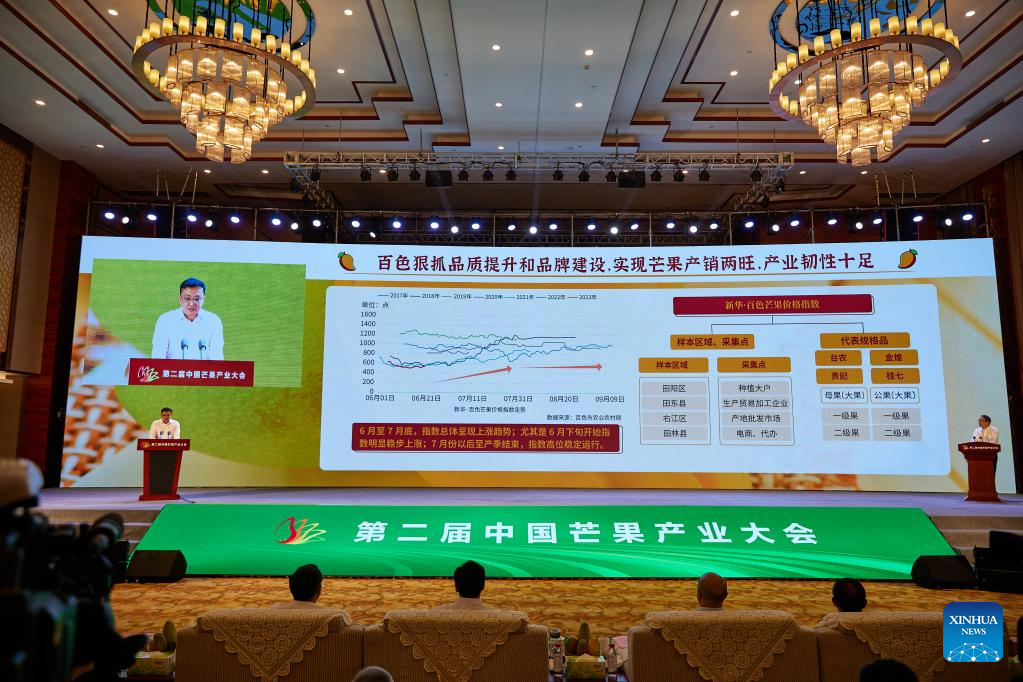 The 2nd China Mango Industry Conference is held in Tiandong County of Baise City in south China's Guangxi Zhuang Autonomous Region, June 28, 2023.(China Mango Industry Conference/Handout via Xinhua)