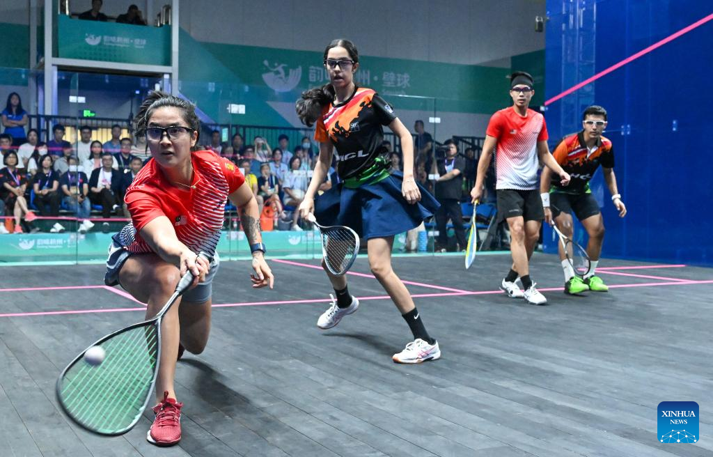Rachel Mae Arnold (1st L)/Yuen Chee Wern (2nd R) of Malaysia compete during the semifinal match against Anahat Singh/Abhay Singh of India at the "Exciting Hangzhou" Asian Squash Mixed Doubles Tournament 2023 in Hangzhou, east China's Zhejiang province, June 29, 2023. (Xinhua/Sun Fanyue)