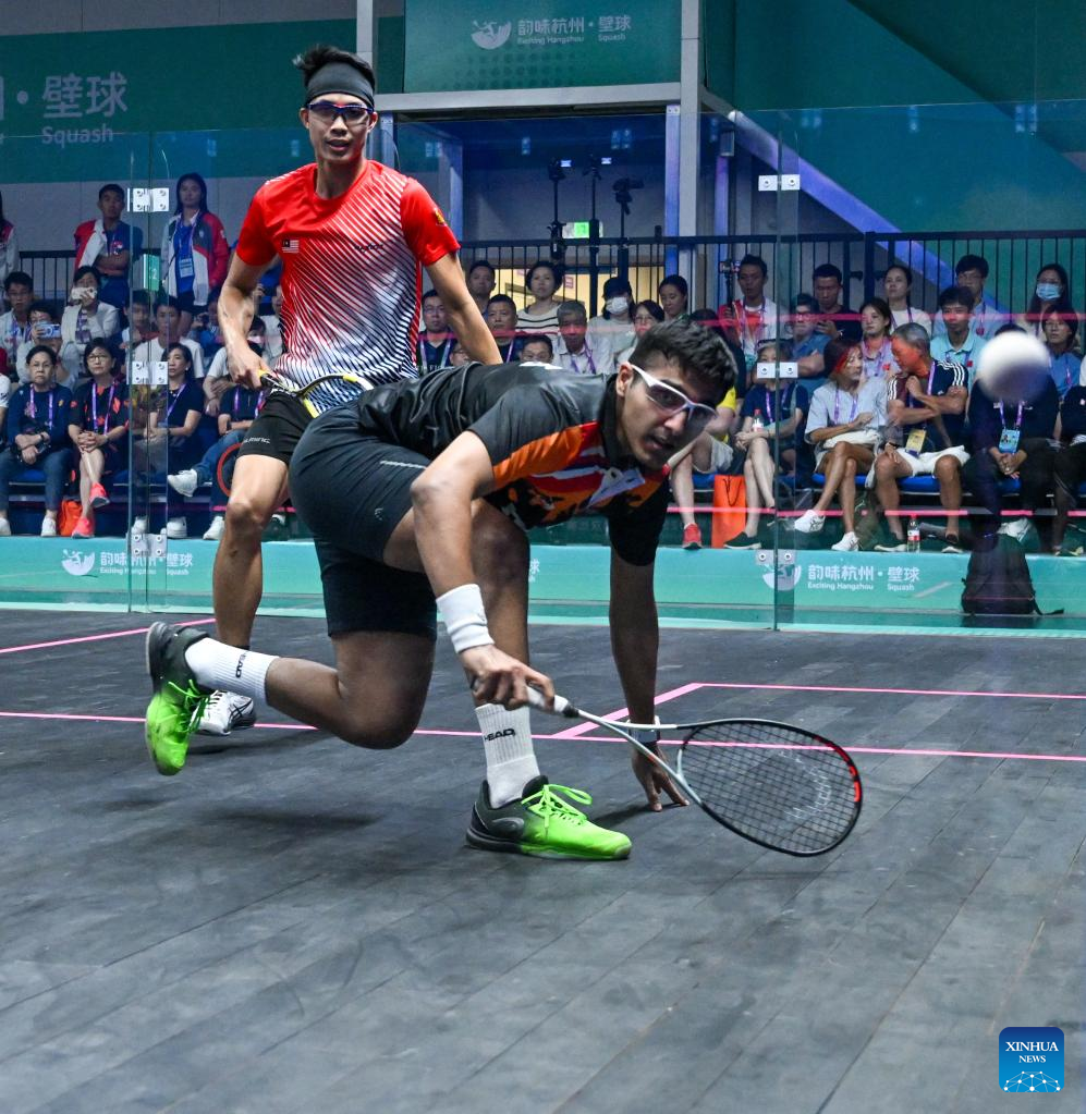 Yuen Chee Wern (R) and Abhay Singh compete during the semifinal match between Rachel Mae Arnold/Yuen Chee Wern of Malaysia and Anahat Singh/Abhay Singh of India at the "Exciting Hangzhou" Asian Squash Mixed Doubles Tournament 2023 in Hangzhou, east China's Zhejiang province, June 29, 2023. (Xinhua/Sun Fanyue)