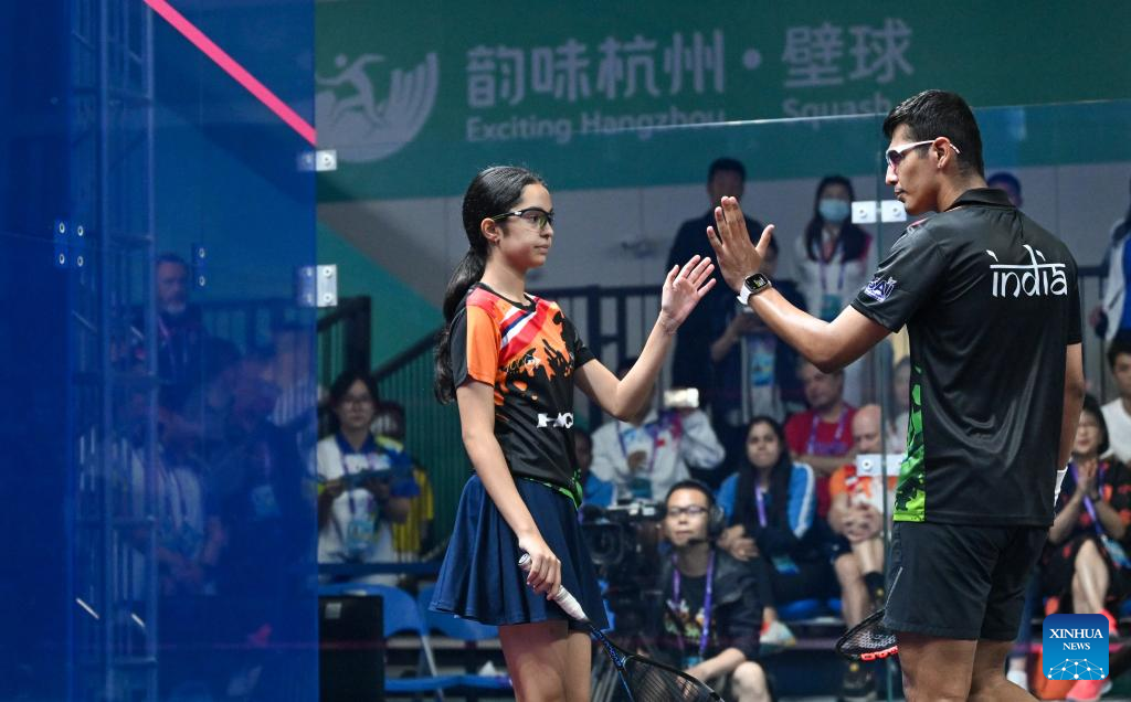 Anahat Singh (L)/Abhay Singh of India celebrate during the semifinal match against Rachel Mae Arnold/Yuen Chee Wern of Malaysia at the "Exciting Hangzhou" Asian Squash Mixed Doubles Tournament 2023 in Hangzhou, east China's Zhejiang province, June 29, 2023. (Xinhua/Sun Fanyue)