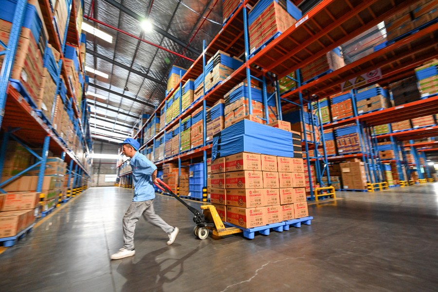 A worker transports anchovy products in a warehouse of Jinzai Food Group Company Limited in Yueyang, central China's Hunan Province, June 28, 2023. (Xinhua/Chen Yehua)