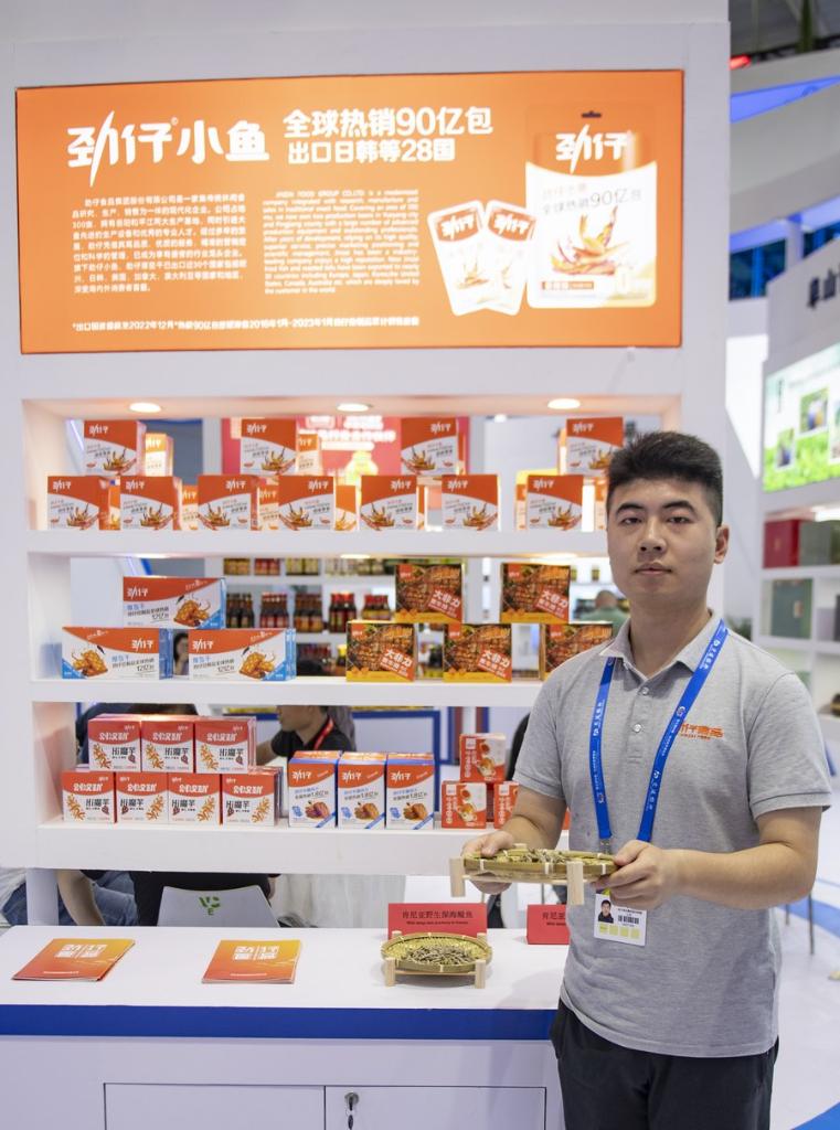 A staff member shows wild anchovy products at the third edition of the China-Africa Economic and Trade Expo in Changsha, central China's Hunan Province, June 29, 2023. (Xinhua/Sun Ruibo)
