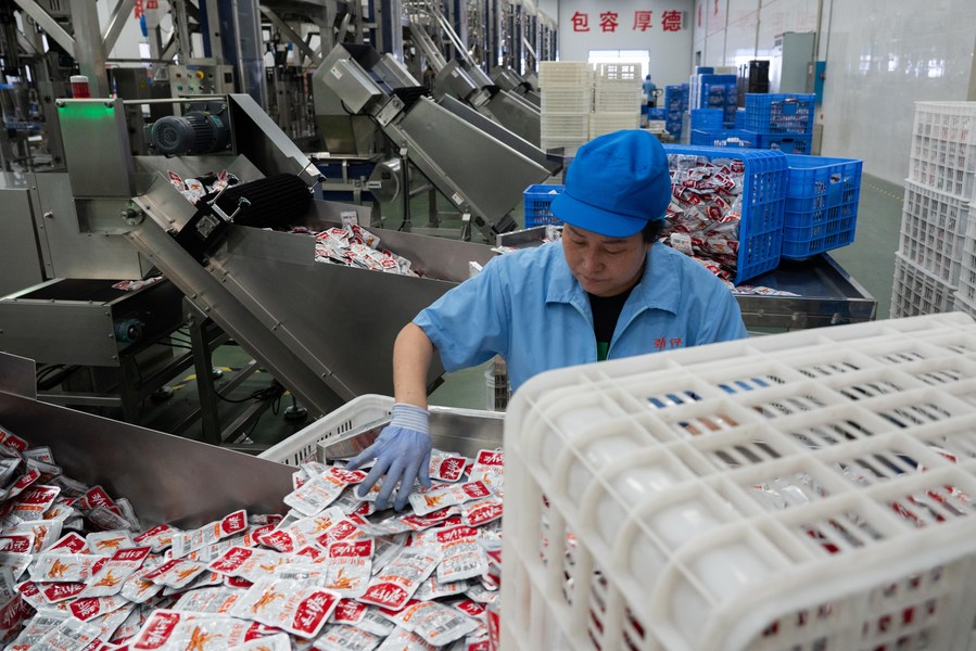An employee works at a packaging workshop of Jinzai Food Group Company Limited in Yueyang, central China's Hunan Province, June 28, 2023. (Xinhua/Chen Yehua)