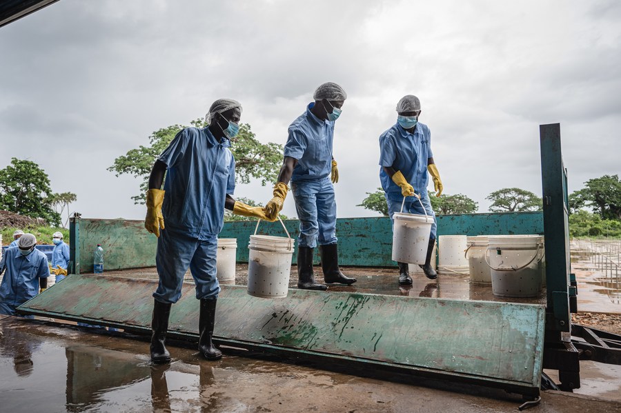 Workers prepare to take fresh anchovies to the processing plant in Kwale, Kenya, June 22, 2023. (Xinhua/Wang Guansen)