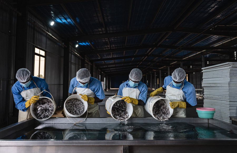 Workers clean anchovies at a processing plant in Kwale, Kenya, June 22, 2023. (Xinhua/Wang Guansen)■