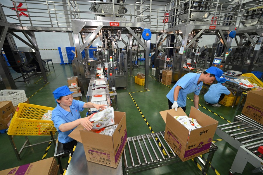Workers pack anchovy products at a production base of Jinzai Food Group Company Limited in Yueyang, central China's Hunan Province, June 28, 2023. (Xinhua/Chen Yehua)