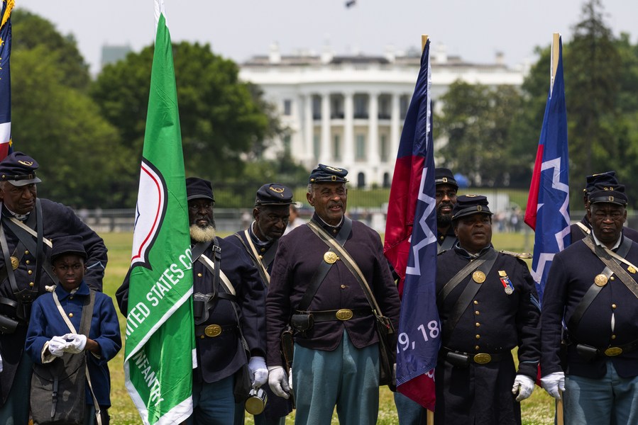Members of a Civil War re-enactment troop are seen with the White House in the background during Juneteenth celebrations in Washington, D.C., the United States, on June 19, 2023. (Photo by Aaron Schwartz/Xinhua)