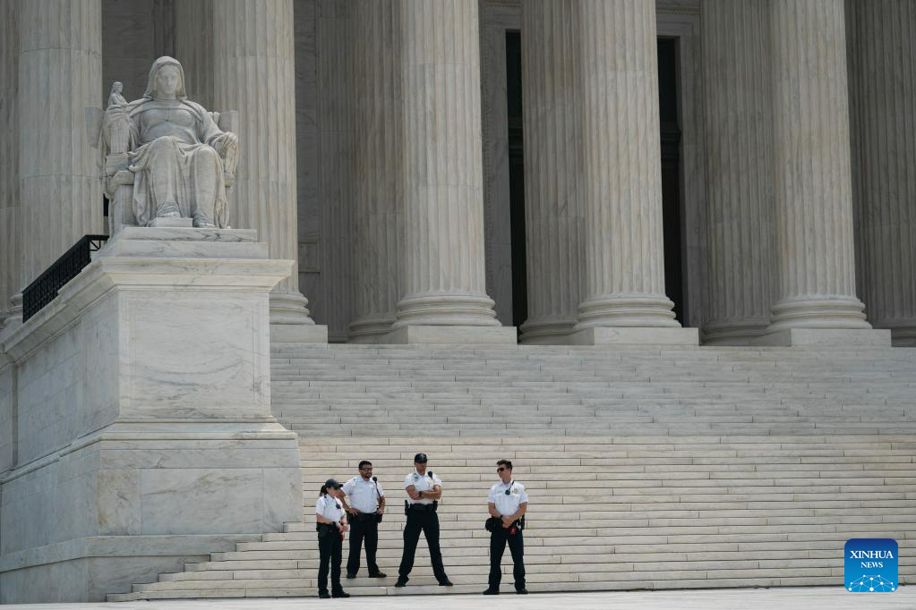 Police officers stand guard outside the U.S. Supreme Court in Washington, D.C., the United States, on June 29, 2023. (Xinhua/Liu Jie)