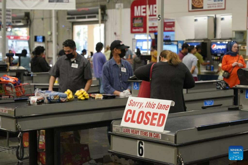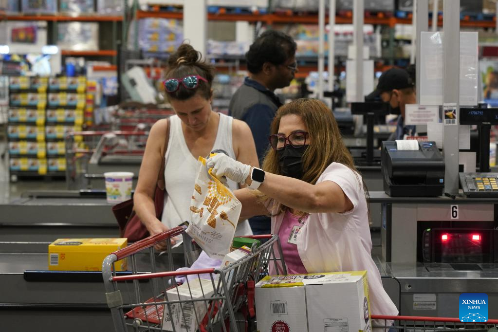 Customers check out in a supermarket in Foster City, the United States, June 29, 2023. The growth rate of U.S. gross domestic product (GDP) was revised up notably to 2 percent in the first quarter, up from the previous estimate of 1.3 percent, according to data issued by the U.S. Bureau of Economic Analysis on Thursday. (Xinhua/Wu Xiaoling)