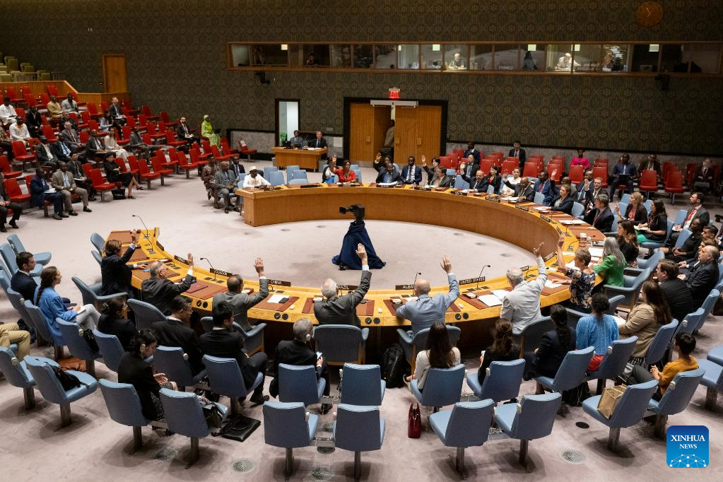 This photo shows the UN Security Council voting on a resolution on Mali at the UN headquarters in New York on June 30, 2023. The United Nations Security Council on Friday adopted a resolution to end the mandate of the UN Multidimensional Integrated Stabilization Mission in Mali (MINUSMA) as of June 30. (Manuel Elías/UN Photo/Handout via Xinhua)