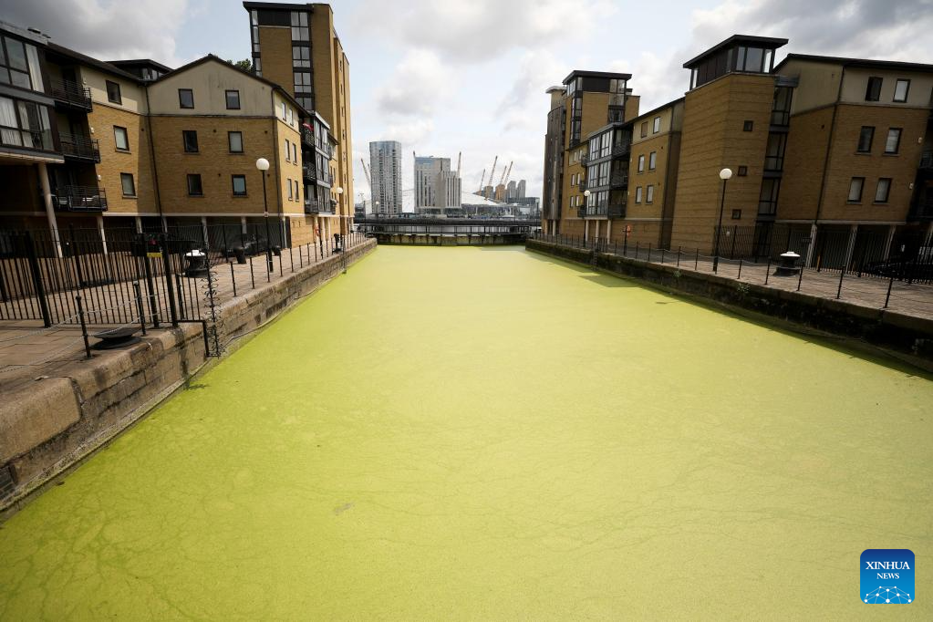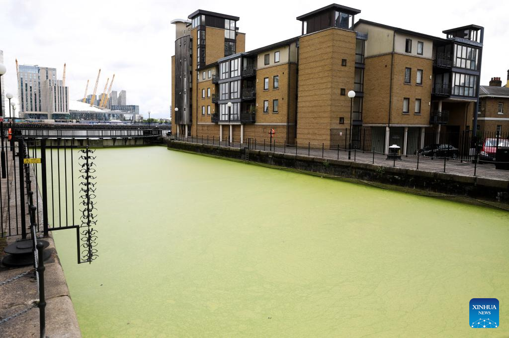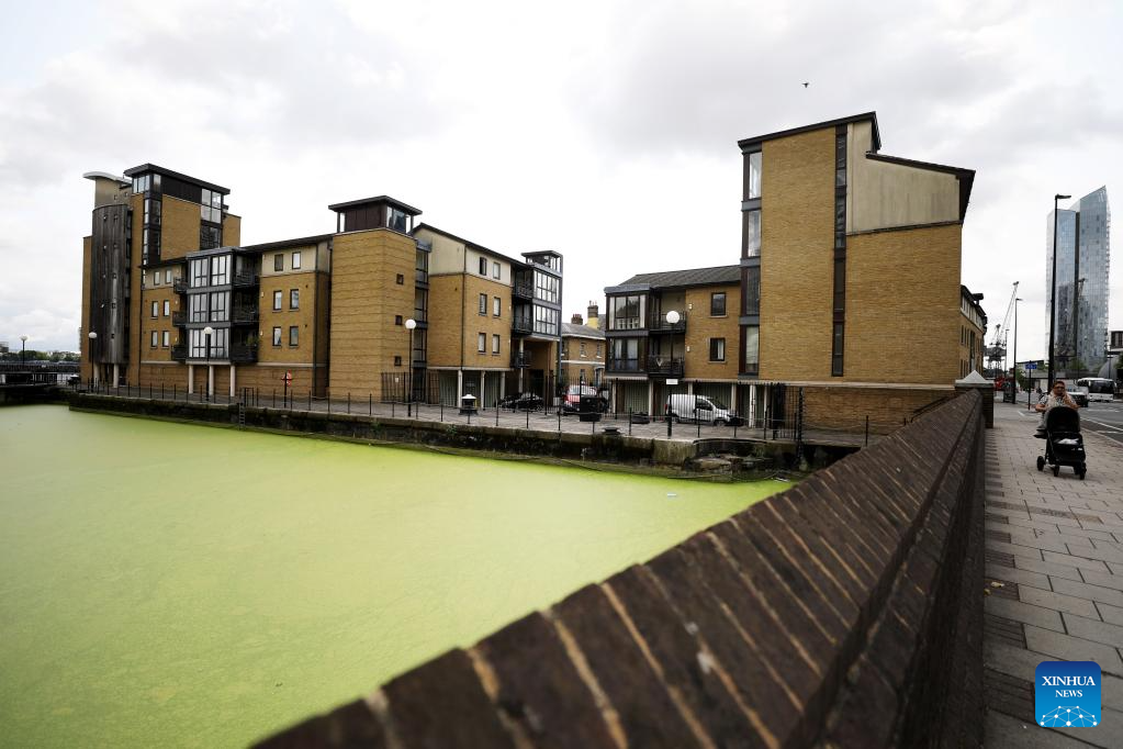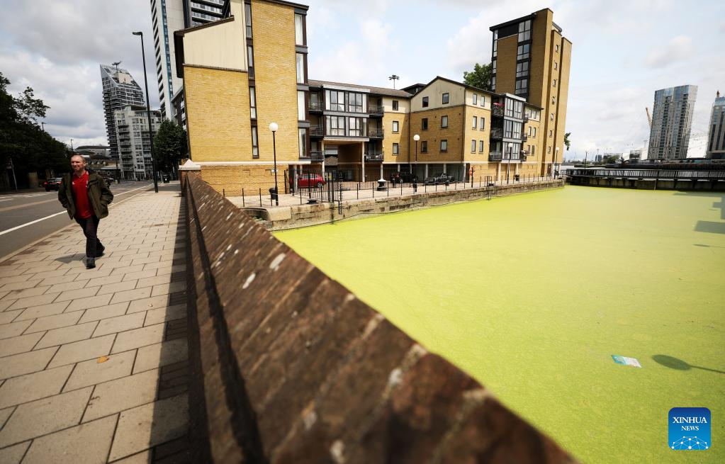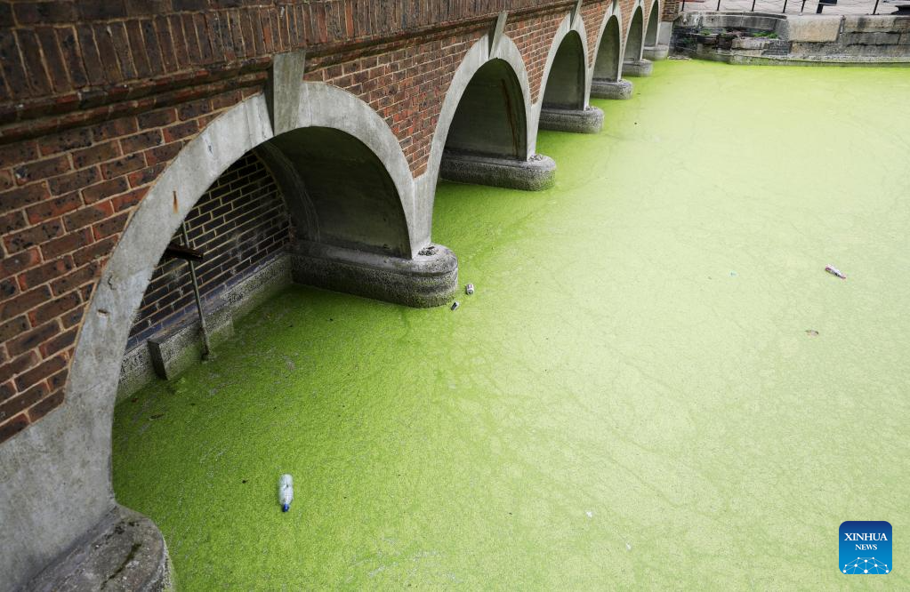 This photo taken on June 29, 2023 shows a section of the River Thames covered by floating duckweed in London, Britain. (Xinhua/Li Ying)
