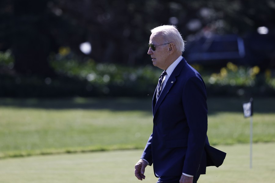U.S. President Joe Biden walks on the South Lawn to board Marine One at the White House in Washington, D.C., the United States, March 9, 2023. (Photo by Ting Shen/Xinhua)