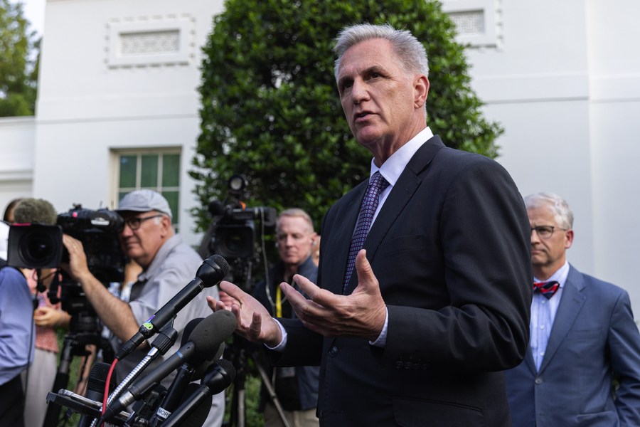 Republican House Speaker Kevin McCarthy speaks to the press after a meeting with President Joe Biden on debt ceiling in Washington, D.C., the United States, May 22, 2023. (Photo by Aaron Schwartz/Xinhua)