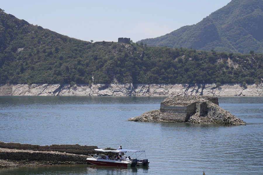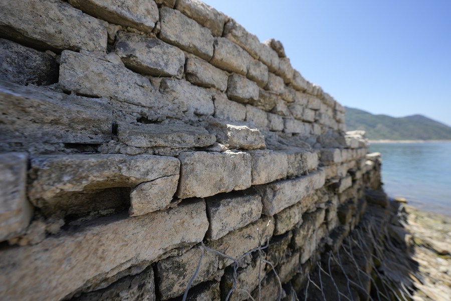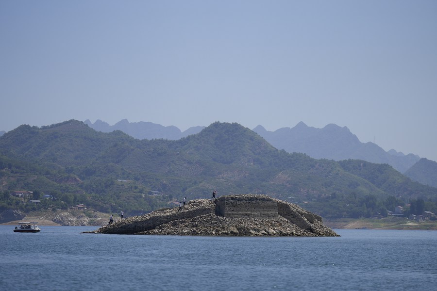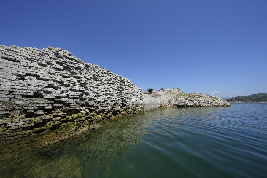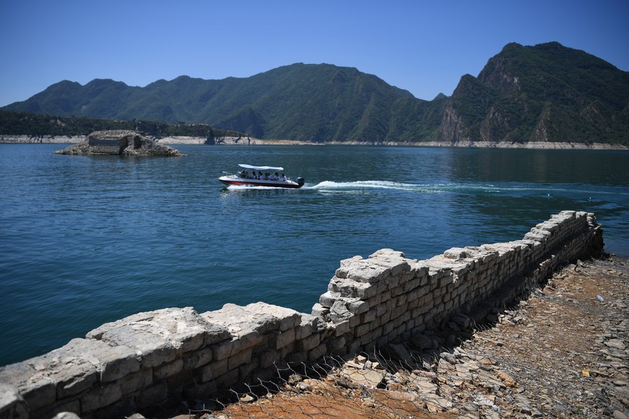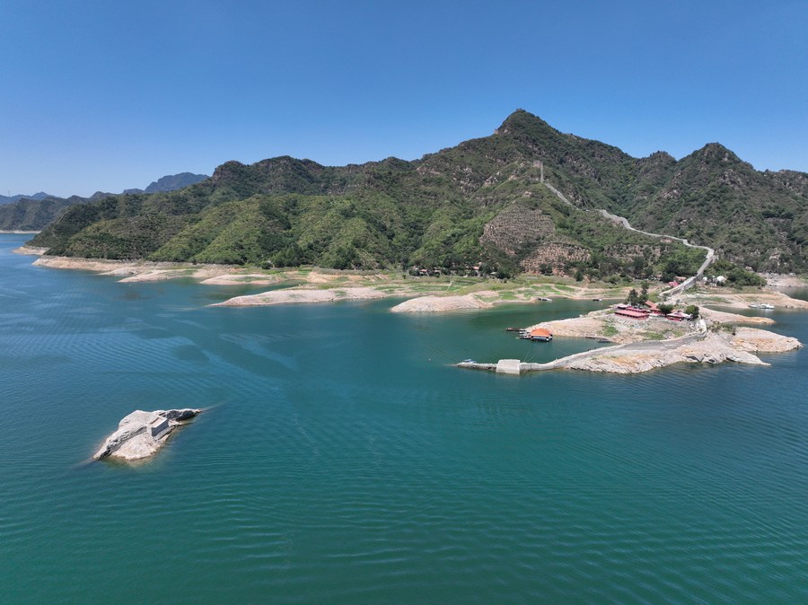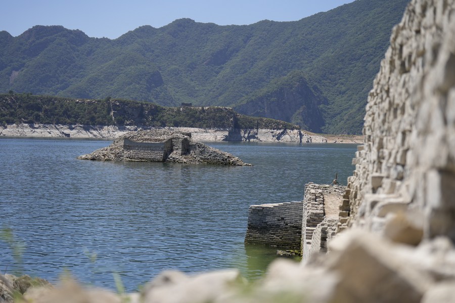 This photo taken on June 29, 2023 shows a partly submerged section of the Great Wall at Panjiakou reservoir in north China's Hebei Province. (Xinhua/Mu Yu)