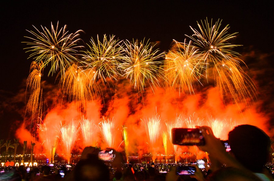 Fireworks light up the sky over Lusail Boulevard during celebrations of the Eid al-Adha festival in Lusail, Qatar, June 28, 2023. (Photo by Nikku/Xinhua)