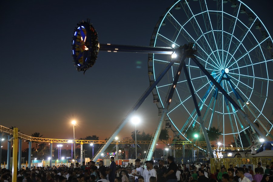 People spend time at an amusement park during the Eid al-Adha holiday in Baghdad, Iraq, on June 29, 2023. (Xinhua/Khalil Dawood)