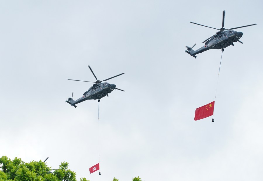 As China's national flag and the flag of the HKSAR were hoisted, helicopters of the Government Flying Service flew over Victoria Harbor to display the national flag and flag of the HKSAR.