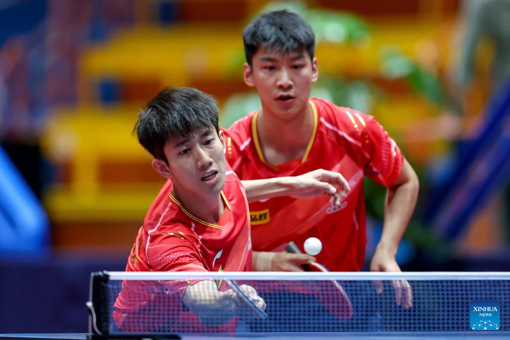 Xue Fei/Liang Yanning(R) of China compete during the men's doubles quarterfinal match against Kwan Man Ho/Li Hon Ming of China's Hong Kong at the 2023 World Table Tennis (WTT) Contender Zagreb in Zagreb, Croatia on June 30, 2023. (Photo by Igor Kralj/PIXSELL via Xinhua)