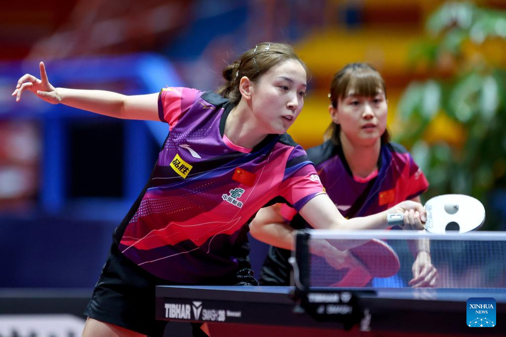 Qian Tianyi(L)/Liu Weishan of China compete during the women's doubles quarterfinal match against Kuai Man/He Zhuojia of China at the 2023 World Table Tennis (WTT) Contender Zagreb in Zagreb, Croatia on June 30, 2023. (Photo by Igor Kralj/PIXSELL via Xinhua)