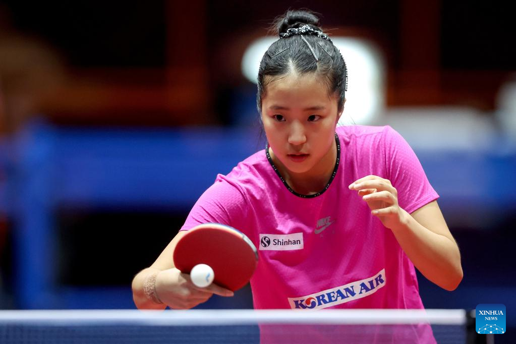 Shin Yubin of South Korea competes during the women's singles round of 16 match against Batra Manika of India at the 2023 World Table Tennis (WTT) Contender Zagreb in Zagreb, Croatia on June 30, 2023. (Photo by Igor Kralj/PIXSELL via Xinhua)