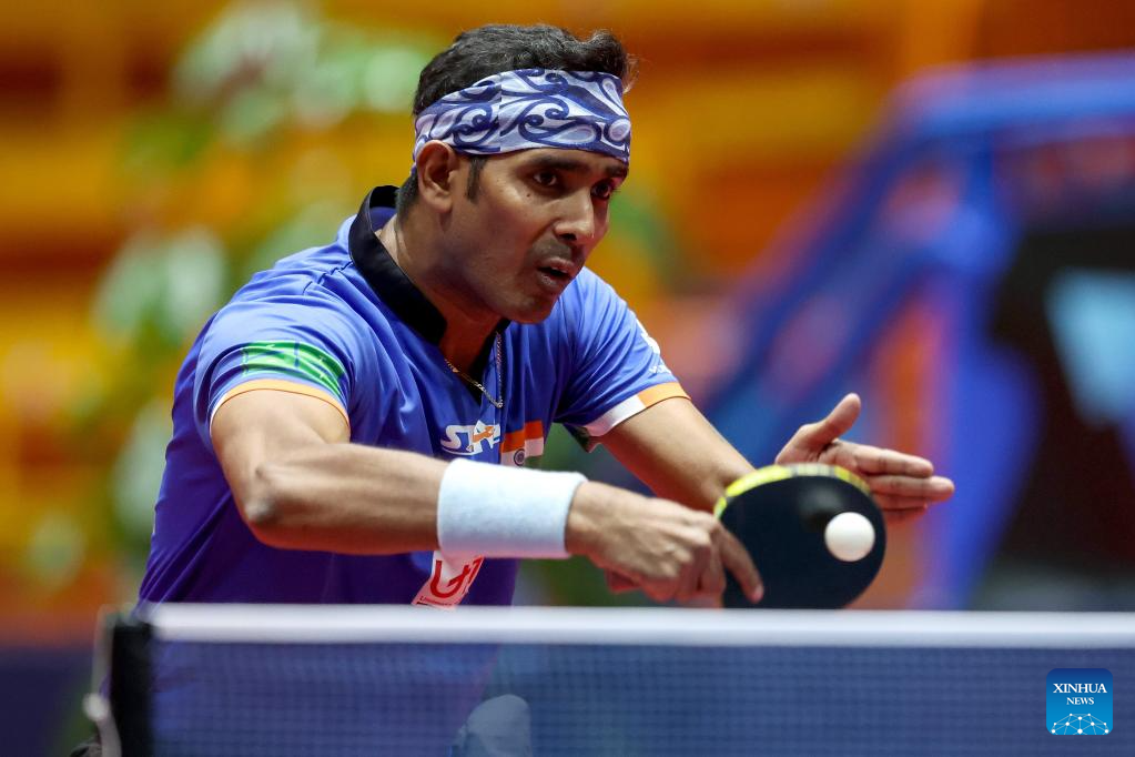 Sharath Kamal Achanta of India competes during the men's singles round of 16 match against Lin Shidong of China at the 2023 World Table Tennis (WTT) Contender Zagreb in Zagreb, Croatia on June 30, 2023. (Photo by Igor Kralj/PIXSELL via Xinhua)
