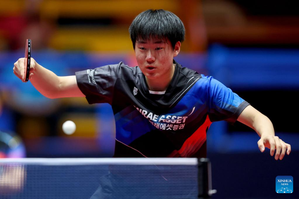 Oh Junsung of South Korea competes during the men's singles round of 16 match against Fan Zhendong of China at the 2023 World Table Tennis (WTT) Contender Zagreb in Zagreb, Croatia on June 30, 2023. (Photo by Igor Kralj/PIXSELL via Xinhua)