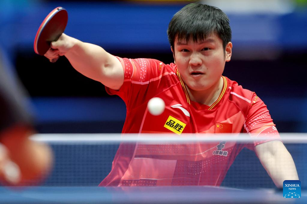 Fan Zhendong of China competes during the men's singles round of 16 match against Oh Junsung of South Korea at the 2023 World Table Tennis (WTT) Contender Zagreb in Zagreb, Croatia on June 30, 2023. (Photo by Igor Kralj/PIXSELL via Xinhua)