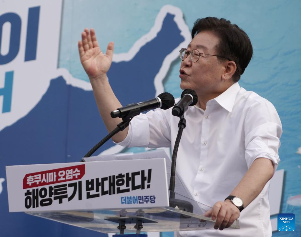 Lee Jae-myung, chairman of South Korea's main opposition Democratic Party (DP), addresses a rally to oppose Japan's nuclear-contaminated water discharge plan in Seoul, South Korea, July 1, 2023. South Korea's DP held a rally in central Seoul on Saturday to oppose Japan's nuclear-contaminated water discharge plan and urge the government to make clear its opposition to Japan's plan. According to the DP, nearly 100,000 people took part in the rally. Lee Jae-myung said that if Japan wants to pollute the sea, (the South Korean government) should openly oppose it. (Photo by James Lee/Xinhua)