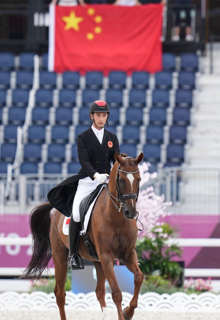 Alex Hua Tian of China and his horse perform during the equestrian dressage team and individual day 1 at the Tokyo 2020 Olympic Games in Tokyo, Japan, July 30, 2021. (Xinhua/Zhu Zheng)